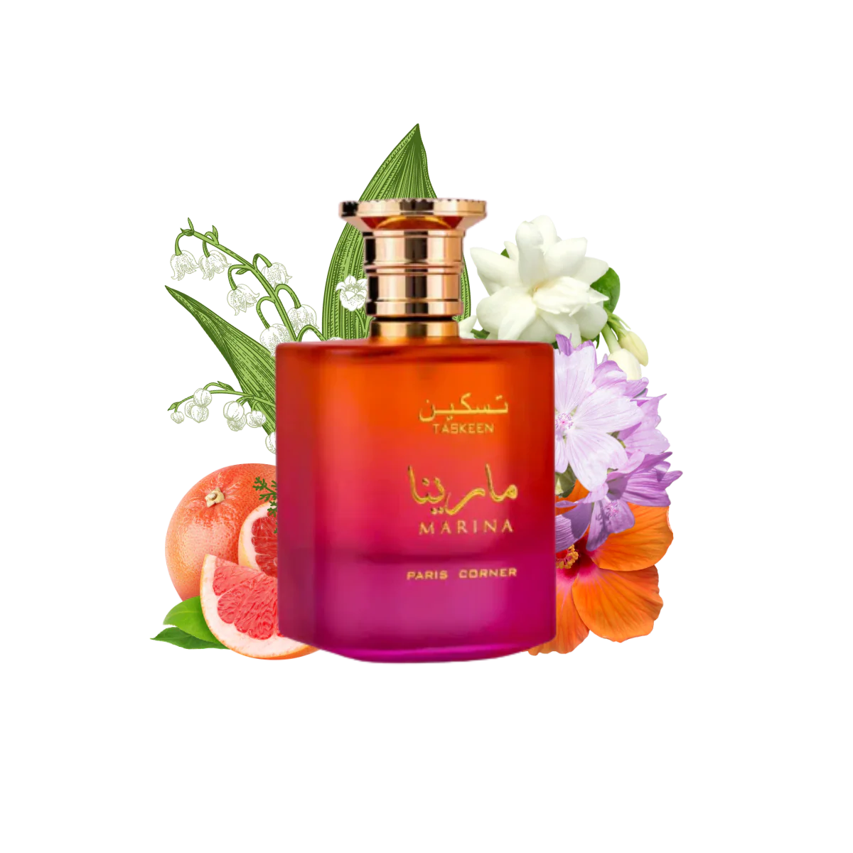 The top notes include tropical orange and grapefruit, providing a bright citrus opening. The middle notes feature lily of the valley, jasmine, and peach, adding light floral and fruity elements. The base notes consist of musk and black currant, which provide depth and a soft, lasting finish.